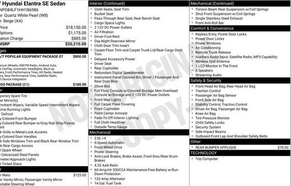 2017 HYUNDAI ELANTRA SE Popular Pkg, SE Tech pkg, Limited | 5NPD84LF9HH087798